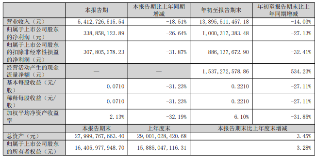 其中,公司第三季度实现营业收入54.13亿元,同比下降18.51%;归母净利润3.39亿元,同比下降26.64%。