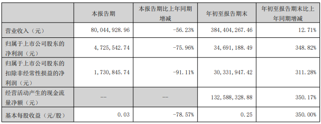 其中,第三季度营收约8004.5万元,同比减少56.23%;归属于上市公司股东的净利润约472.6万元,同比减少75.96%。