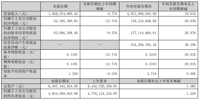 第三季度营收为16.29亿元,同比增长6.77%;净利润为6339.94万元,下降12.71%。