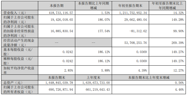 其中第三季度,公司营业收入为4.19亿元,同比上升1.5%;归母净利润自去年同期亏损2257万元成功扭亏,实现归母净利润1943万元;扣非归母净利润自去年同期亏损2178万元成功扭亏,实现扣非归母净利润1689万元;EPS为0.0242元。
