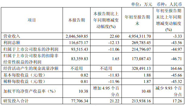 10月28日,传音控股公告,2025年第三季度实现营业收入204.66亿元,同比增长22.60%;归属于上市公司股东的净利润9.35亿元,同比下降11.06%;基本每股收益0.82元。前三季度实现营业收入495.43亿元,同比下降3.33%;归属于上市公司股东的净利润21.48亿元,同比下降44.97%;基本每股收益1.88元。