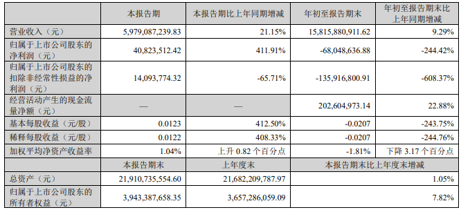 10月29日,欧菲光(002456.SZ)发布2025年第三季度报告,第三季度营收为59.79亿元,同比增长21.15%;净利润为4082.35万元,同比增长411.91%。前三季度营收为158.16亿元,同比增长9.29%;归属于上市公司股东的净利润为-6804.86万元。