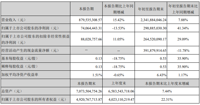 飞凯材料:第三季度归母净利润同比下降13.53%