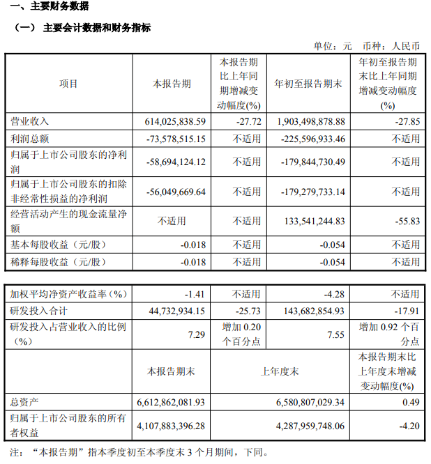 第三季度营收为6.14亿元,同比下降27.72%;净利润亏损5869.41万元。