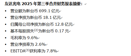 10月30日,友达光电今日举行法人说明会公布2025年第三季合并财务报表。总计2025年第三季合并营业额为新台币699.1亿元,较2025年第二季增加1.0%,与2024年第三季相比减少10.1%。2025年第三季归属母公司业主之净损为新台币12.8亿元,基本每股损失则为新台币0.17元。