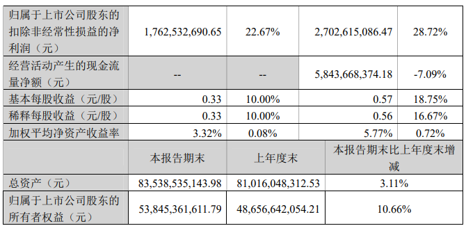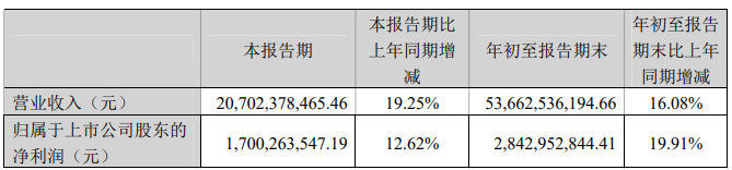 其中第三季度,公司营业收入为207.0亿元,同比上升19.3%;归母净利润为17.0亿元,同比上升12.6%;扣非归母净利润为17.6亿元,同比上升22.7%;EPS为0.3218元。