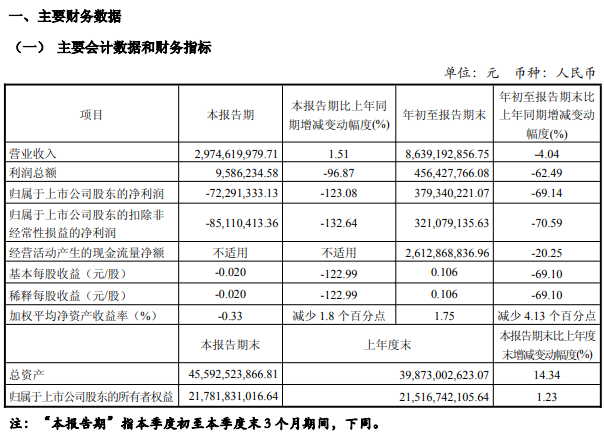 前三季度公司实现营业收入86.39亿元,同比下降4.04%;前三季度归属于上市公司股东的净利润3.79亿元,同比下降69.14%。