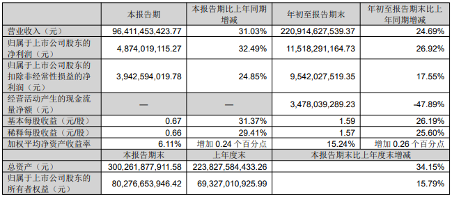10月30日,立讯精密(002475)发布公告, 第三季度实现营业收入964.11亿元,同比增加31.03%;归属于上市公司股东的净利润48.74亿元,同比增加32.49%;扣非净利润39.43亿元,同比增加24.85%;基本每股收益0.67元。