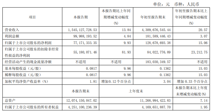 其中,第三季度营收为15.45亿元,同比增长13.84%;净利润为7717.13万元,同比增长9.93%。前三季度营收为43.1亿元,同比增长20.57%;净利润为1.29亿元,同比增长15.06%。