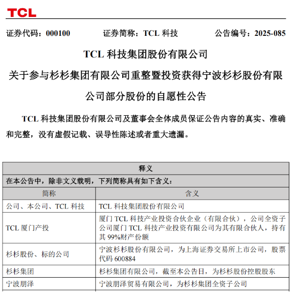 9月30日,TCL科技公告,通过TCL厦门产投,与新扬子商贸、新扬船投资、中国东方深圳分公司组成联合投资方,参与杉杉集团及其全资子公司宁波朋泽的合并破产重整,投资额不超过5亿元。