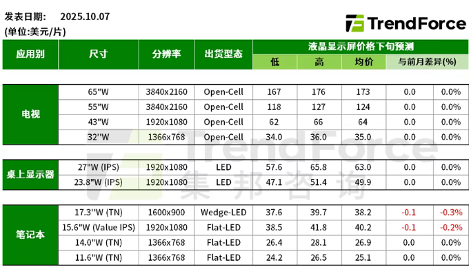 10月7日,根据TrendForce集邦咨询显示器研究中心最新调研数据,2025年10月,电视与显示器面板价格预估不变,部分尺寸笔电面板价格预计有小幅度下调。