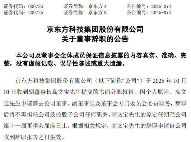 10月10日,京东方A(000725.SZ)公告称,公司于2025年10月10日收到副董事长高文宝的书面辞职报告,高文宝因个人原因申请辞去公司董事、副董事长及董事会专门委员会委员职务,辞职后不再担任公司及控股子公司任何职务。