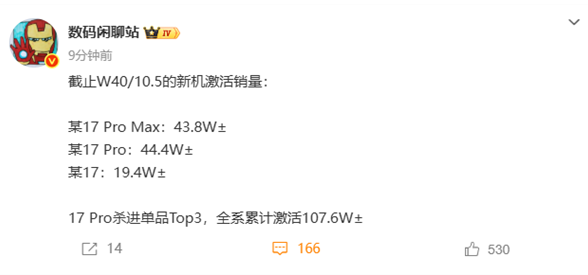 据博主数码闲聊站透露的信息,这次Pro系列成了支柱,17 Pro Max、17 Pro两款销量均突破了40万。