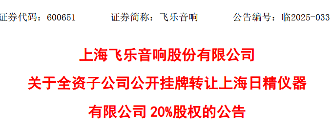 10月11日,上海飞乐音响股份有限公司(简称“飞乐音响”)发布公告称,其全资子公司上海仪电汽车电子系统有限公司(简称“上海仪电”)拟通过上海联合产权交易所公开挂牌方式,转让所持有的联营企业上海日精仪器有限公司20%股权,首次挂牌转让底价为10,363.154万元。