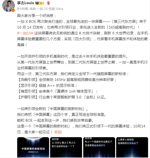 一加中国区总裁李杰表示:“一加和BOE联合打造的「第三代东方屏」将再次引领行业,率先进入全新的「165超高刷时代」,这块屏幕将通过史无前例的8大技术突破,刷新9大世界纪录,在手机屏幕体验最重要的几个方面实现引领,代表着手机屏幕技术和体验的最高峰,这是一个中国屏幕的刷新时刻!”