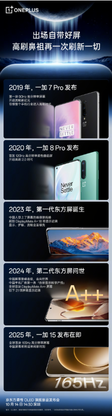 10月11日,一加宣布将与京东方联合推出「第三代东方屏」,将于本月14日正式发布,并由「性能Ultra」一加15首发搭载。