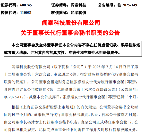 10月12日,闻泰科技(600745)发布公告,公司董事会决定由董事长杨沐代行董事会秘书职责,原因是公司董事会秘书空缺时间已超过三个月。此前,财务总监张彦茹代行该职责已满三个月。根据相关规定,董事长需在此情况下接任董事会秘书职务,直至公司正式聘任新的董事会秘书。