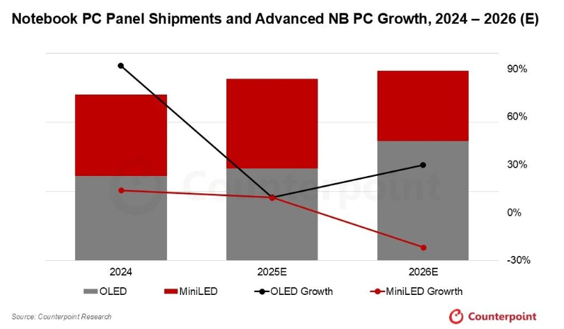 Counterpoint Research表示,在该市场中,采用OLED与MiniLED技术的高端PC面板预计将同比增长9%,占2025年笔记本电脑总出货量的8%。与此同时,OLED笔记本电脑面板预计将在2025年实现9%的同比增长,2026年出货量预计将同比提升30%。苹果即将推出的14.3英寸和16.3英寸OLED MacBook Pro机型预计将进一步加快OLED在IT设备领域的渗透速度。