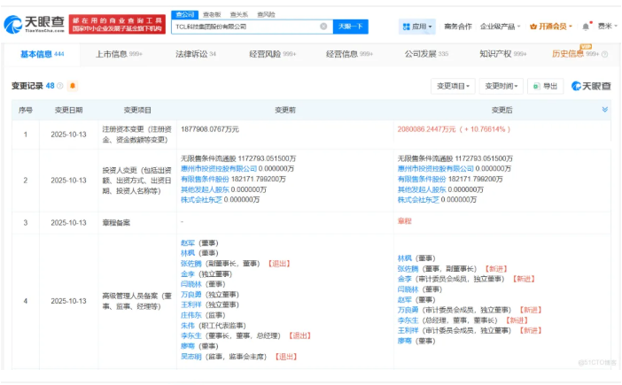 10月17日消息,天眼查App显示,近日,TCL科技发生工商变更,注册资本由约187.8亿人民币增至约208亿人民币,增幅约11%。