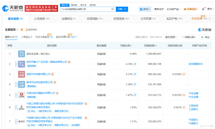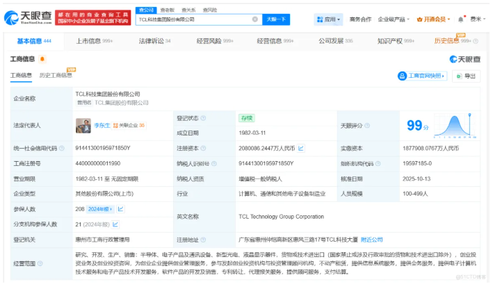 资料显示,TCL科技集团股份有限公司成立于1982年3月,法定代表人为李东生,经营范围包括不动产租赁、提供信息系统服务、提供会务服务等,由深圳市重大产业发展一期基金有限公司、香港中央结算有限公司、惠州市投资控股有限公司等共同持股。