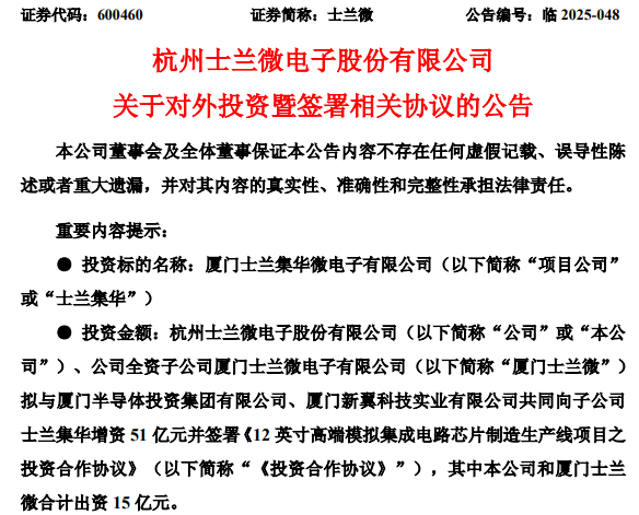 10月19日晚,士兰微公告,公司与厦门市人民政府、厦门市海沧区人民政府于10月18日在厦门市签署了《12英寸高端模拟集成电路芯片制造生产线项目战略合作协议》,同时,公司全资子公司厦门士兰微拟与厦门半导体投资集团有限公司、厦门新翼科技实业有限公司共同向子公司士兰集华增资51亿元并签署《12英寸高端模拟集成电路芯片制造生产线项目之投资合作协议》。