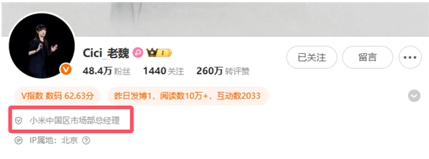 公开信息显示,魏思琪于2013年加入小米,早期负责小米官网产品页设计及发布会PPT制作,2018年加入小米CC团队,转向产品设计领域,参与面向年轻用户群体的产品打造;2021年12月起,她接任小米数字系列产品线负责人,主导核心旗舰产品的规划与推进。在此番调整前,魏思琪已同时担任小米手机市场部总经理与小米汽车市场部副总经理。目前,其微博账号认证信息已同步更新为“小米中国区市场部总经理”,进一步确认了这一职务变动。