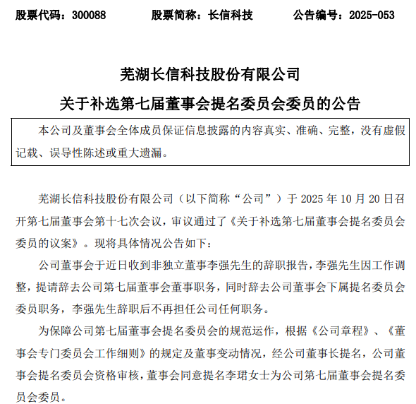 10月20日晚间,长信科技发布公告称,公司董事会于近日收到非独立董事李强先生的辞职报告,李强先生因工作调整,提请辞去公司第七届董事会董事职务,同时辞去公司董事会下属提名委员会委员职务,李强先生辞职后不再担任公司任何职务。