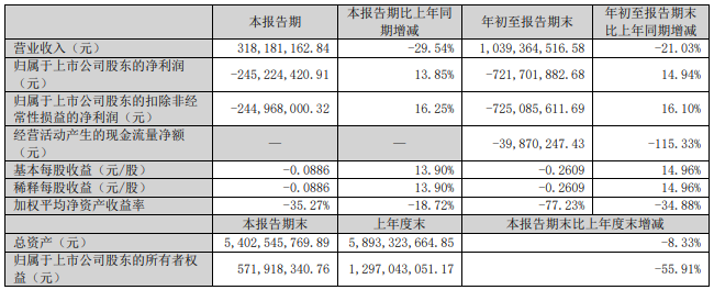 前三季度实现营业收入10.39亿元,同比下降21.03%;归属于上市公司股东的净利润亏损7.22亿元;基本每股收益-0.2609元。