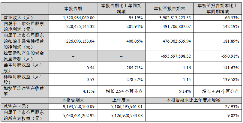 公司第三季度营业收入15.21亿元,同比增长95.19%;归属于上市公司股东的净利润2.28亿元,同比增长281.94%。营收增长主要受益于AI服务器高多层板需求旺盛及创新设备销售增长。