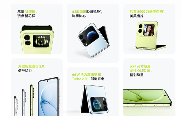 据了解,nova Flip S延续nova Flip外观设计,依然是2.14英寸1:1方形外屏,分辨率为480*480,支持通话趣显、可爱萌宠、DIY壁纸、效率桌面、外屏实况窗。