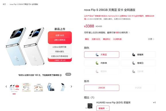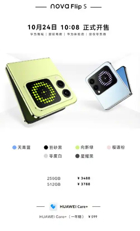 10月24日消息,今日,华为nova Flip S正式开售,售价3488元起,首发优惠100元,到手3388元起,这是华为最便宜的折叠屏手机。