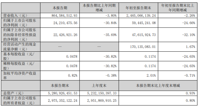 其中,第三季度,公司营业收入为8.65亿元,同比下降3.80%;归母净利润为2421.05万元,同比下降30.84%;扣非归母净利润为2242.69万元,同比下降35.69%。