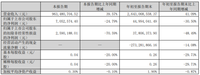 其中第三季度,公司营业收入为9.63亿元,同比上升39.6%;归母净利润为705万元,同比下降24.8%;扣非归母净利润为259万元,同比下降70.6%;EPS为0.0406元。