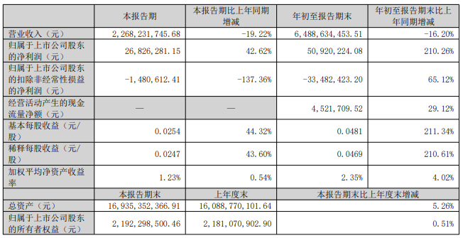 其中第三季度,公司营业收入为22.7亿元,同比下降19.2%;归母净利润为2683万元,同比上升42.6%;扣非归母净利润亏损148万元,同比下降137.4%。