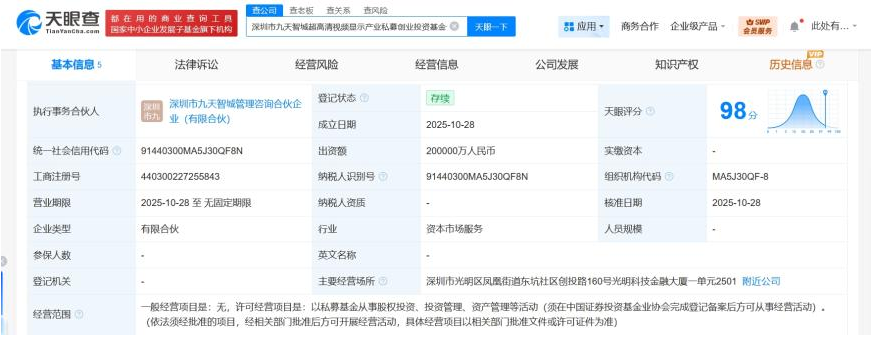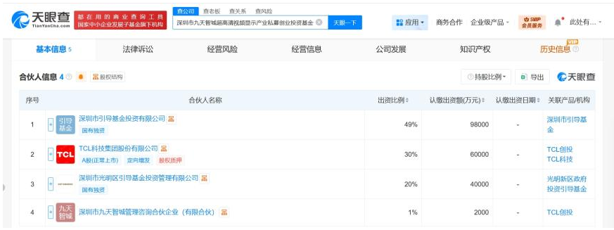 10月28日消息,天眼查工商信息显示,近日,深圳市九天智城超高清视频显示产业私募创业投资基金合伙企业(有限合伙)成立,执行事务合伙人为深圳市九天智城管理咨询合伙企业(有限合伙),出资额20亿人民币,经营范围为以私募基金从事股权投资、投资管理、资产管理等活动。合伙人信息显示,该基金由深圳市引导基金投资有限公司、TCL科技(000100)、深圳市光明区引导基金投资管理有限公司、深圳市九天智城管理咨询合伙企业(有限合伙)共同出资。