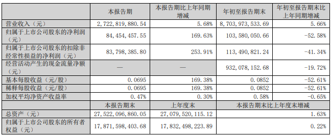 其中第三季度营收约27.2亿元,同比增加5.68%;归属于上市公司股东的净利润约8445.45万元,同比增长169.63%。