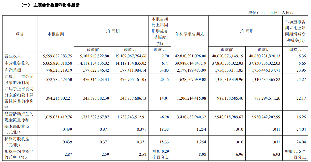 其中,第三季度实现营业收入156亿元,同比增长2.70%;归属于上市公司股东的净利润5.73亿元,同比增长20.15%;基本每股收益0.439元。