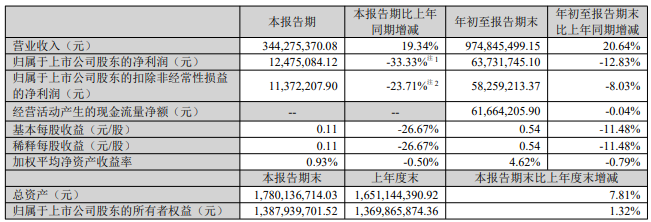 其中,第三季度实现营业收入3.44亿元,较上年同期增长19.34%;归属于上市公司股东的净利润为1247.51万元,同比下降33.33%。