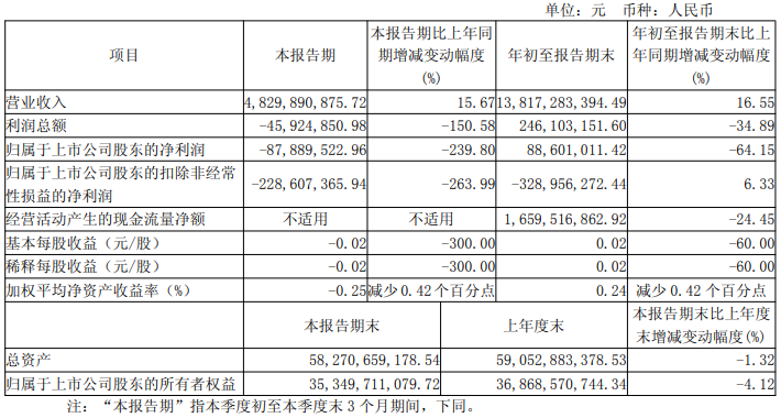 其中,第三季度营收为48.3亿元,同比增长15.67%;净利润亏损8788.95万元,下降239.80%。