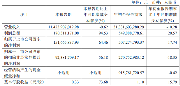 其中第三季度,公司营业收入为114.2亿元,同比下降9.6%;归母净利润为1.52亿元,同比上升64.5%;扣非归母净利润为9238万元,同比上升56.2%;EPS为0.3231元。
