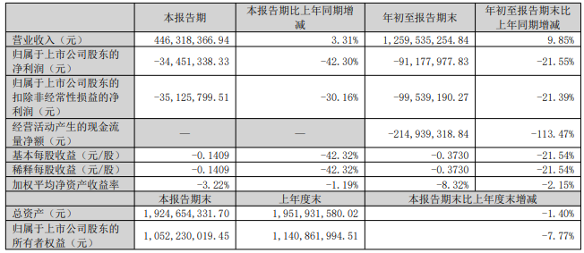 其中,第三季度营收为4.46亿元,同比增长3.31%;净利润亏损3445.13万元,下降42.30%。