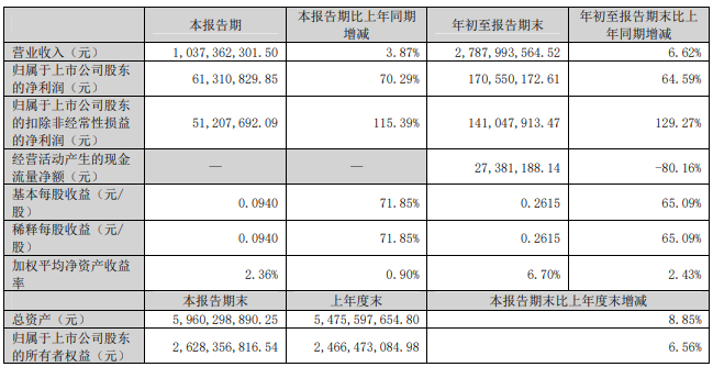 前三季度累计,公司实现营业收入27.88亿元,同比增长6.62%;归母净利润1.71亿元,同比增长64.59%;扣非后净利润1.41亿元,增幅129.27%。