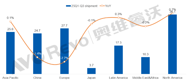 发达市场中,调整后的对等关税公布引发第二波抢出货、以及“黑五”备货拉动下,三季度北美出货增长3.7%,前三季度北美累计TV出货增长0.7%;欧洲市场与日本前三季度出货分别下降2.7%、0.1%;