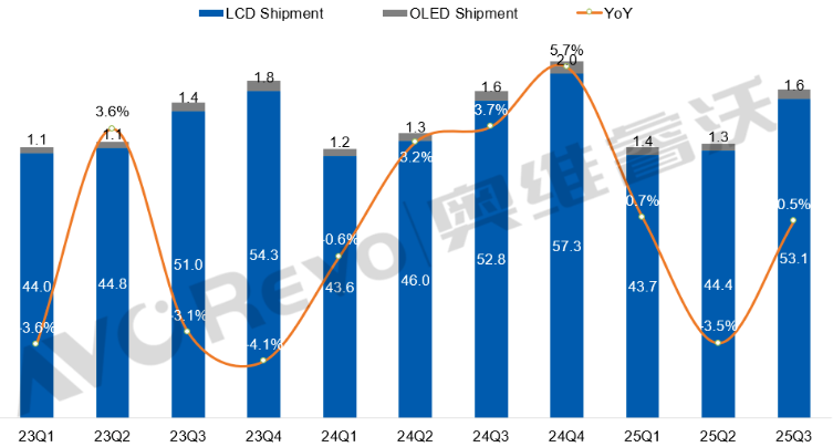 10月31日消息,奥维睿沃(AVC Revo)《全球TV品牌出货月度数据报告》显示,2025年三季度全球TV出货量同比增长0.5%,前三季度累计出货量145.4M,同比下降0.7%;前三季度高端OLED TV出货4.3M,同比增长3.6%;全球TV出货面积113.9M㎡,同比增长1.8%;前三季度出货平均尺寸53.3”,同比增长0.7”,三季度平均尺寸增速明显放缓。