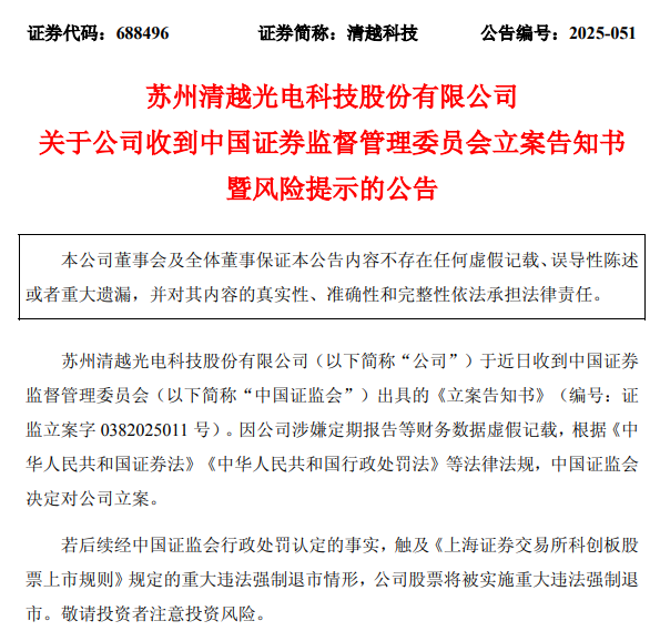 10月31日,清越科技披露公告称,公司于近日收到证监会出具的《立案告知书》。因公司涉嫌定期报告等财务数据虚假记载,根据法律法规,证监会决定对公司立案。公告显示,若后续经证监会行政处罚认定的事实,触及《上海证券交易所科创板股票上市规则》规定的重大违法强制退市情形,清越科技将被实施重大违法强制退市。