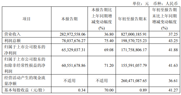 其中,第三季度公司实现营收2.83亿元,同比增长36.80%;归属于上市公司股东的净利润6532.90万元,同比增长69.08%。