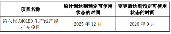 公司基于审慎性原则,结合目前募投项目的实际进展情况,在募投项目实施主体、实施方式、投资总额保持不变的情况下,对募投项目“第六代AMOLED生产线产能扩充项目”达到预定可使用状态的时间进行延期。具体如下: