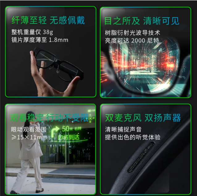 据介绍,这款眼镜采用轻量化设计,整机重量38克,镜片厚度薄至1.8mm,号称“不压迫耳鼻”,内置树脂衍射光波导技术屏幕,亮度可达2000尼特,眼动观看范围(Eyebox)是15*11mm,可在行走中带来更稳定的使用体验。