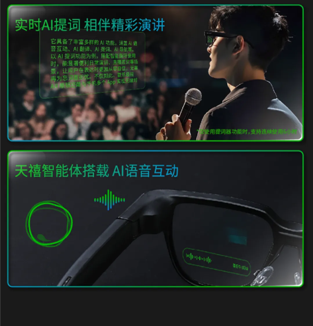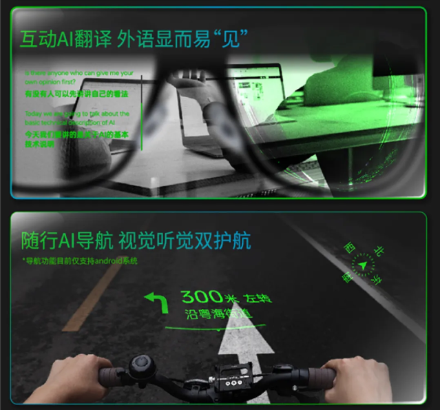 这款眼镜的镜腿搭载有触控板,支持滑动接听电话、查看信息、翻动页面等操作,支持互动AI翻译,号称“戴在眼睛上的翻译耳机”,内置随行AI导航功能,无需看手机就能够在骑车等场合导航,配备提词器功能,可帮助演讲者减少忘词、卡壳现象。