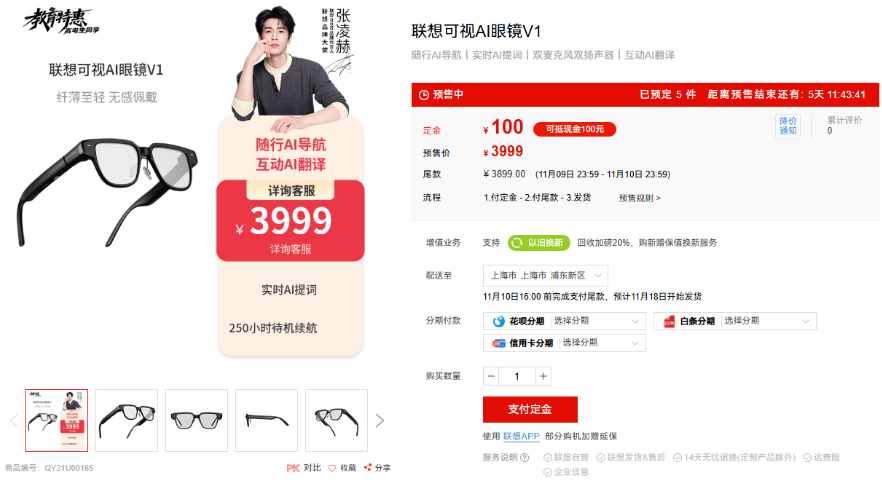 10月31日,联想AI眼镜V1正式发布,首发优惠价3999元,将在11月9日正式发售。